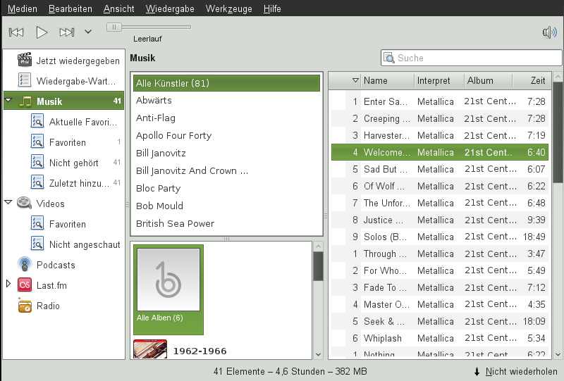 Banshee verfügt über einen integrierten CD-Player. Wenn Sie eine Musik-CD einlegen, wird der Titel der CD im linken Fensterbereich angezeigt. Wenn Sie die CD vollständig abspielen möchten, wählen Sie ihren Titel aus und klicken Sie auf die .