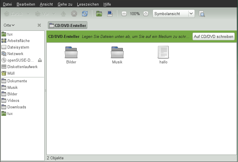 Wenn Ihr System über einen CD- oder DVD-Brenner verfügt, können Sie mithilfe des Nautilus-Datei-Managers CDs und DVDs brennen.