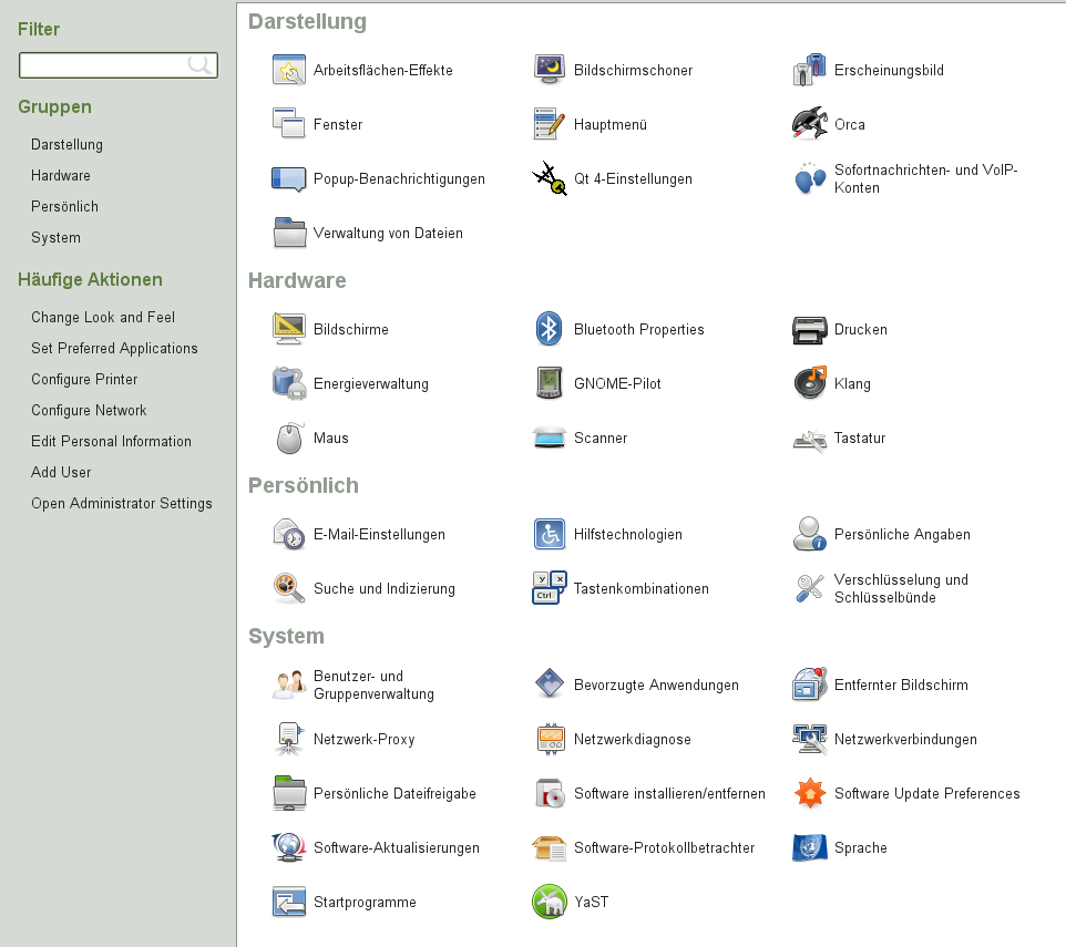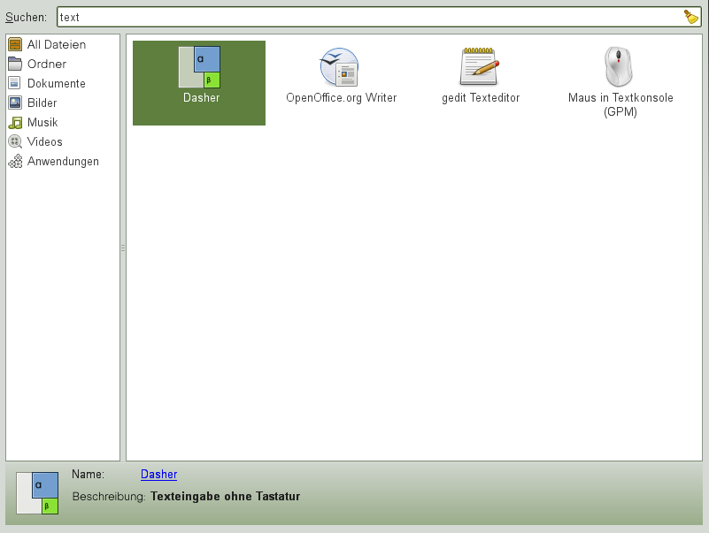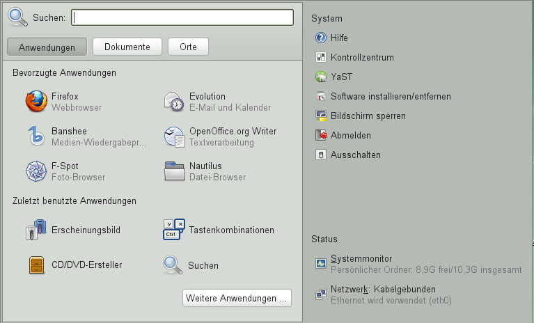 Klicken Sie zum Ausführen eines Programms in openSUSE auf der Kontrollleiste auf , um das Hauptmenü zu öffnen. Wenn das gewünschte Programm im Hauptmenü nicht angezeigt wird, klicken Sie auf , um eine Liste mit allen verfügbaren Anwendungen in Kategorien gruppiert anzuzeigen. Sie können die Liste auch so einschränken, dass nur Anwendungen mit einem bestimmten Namen enthalten sind, indem Sie den jeweiligen Namen oder einen Teil davon in das Feld eingeben. Klicken Sie auf einen Eintrag in der Liste, um das entsprechende Programm zu starten.