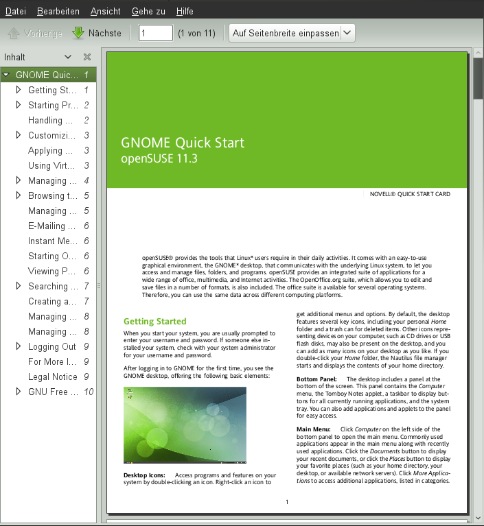 In diesem Handbuch haben Sie eine kurze Einführung in den GNOME-Desktop und einige wichtige Anwendungen erhalten. Weitere Informationen erhalten Sie unter GNOME User Guide (↑GNOME User Guide) und in den anderen Handbüchern, die für openSUSE unter http://www.novell.com/documentation/opensuse113/ oder auf Ihrem installierten System unter /usr/share/doc/manual verfügbar sind.