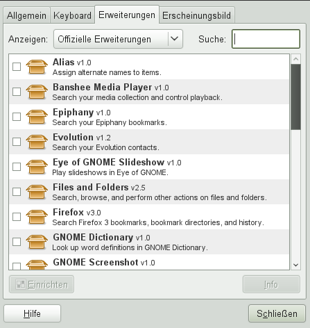 Um GNOME an Ihre Anforderungen anzupassen, wählen Sie die Pfeiltaste oben rechts im Fenster, und wählen Sie . Sie erhalten eine Liste mit Plug-Ins, mit denen Sie Mails in Evolution suchen, Ihre Musikstücke wiedergeben und vieles mehr.