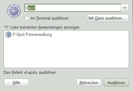 Drücken Sie Alt+F2, um das Dialogfeld zu öffnen. Geben Sie ein Kommando ein, zum Beispiel f-spot, und drücken Sie Eingabetaste oder klicken Sie auf , um die Anwendung zu starten. Das Kommando zum Starten ist meist (aber nicht immer) der Anwendungsname in Kleinbuchstaben.