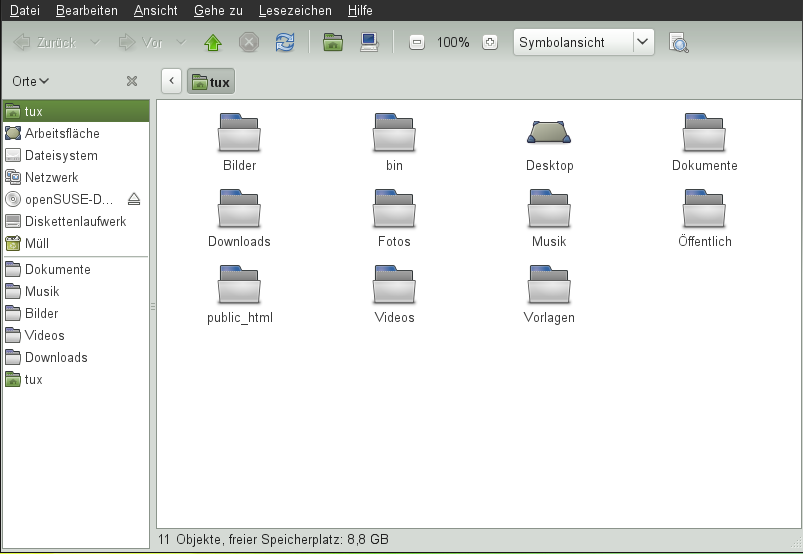 Verwenden Sie den Datei-Manager Nautilus, um Ordner und Dokumente zu erstellen und anzuzeigen, Skripts auszuführen und CDs Ihrer Daten zu erstellen. Doppelklicken Sie zum Öffnen von Nautilus auf das Symbol für Ihr Home-Verzeichnis auf dem Desktop. Der Inhalt Ihres Home-Verzeichnisses wird angezeigt.