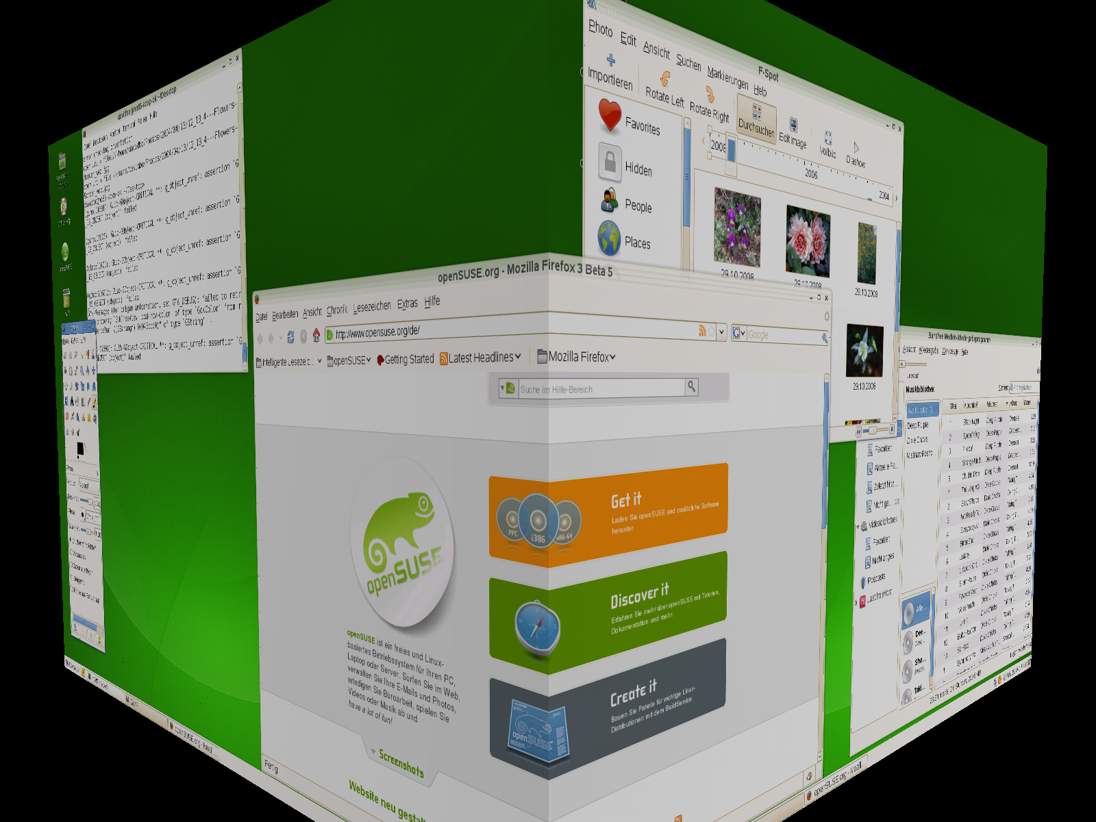 Wenn Ihr Computer eine 3D-Grafikkarte mit Xgl unterstützt, können Sie Grafikeffekte verwenden, wie zum Beispiel Umstellen des Desktops auf einen sich drehenden 3D-Würfel, Aktivieren von durchsichtigen oder transparenten Fenstern oder Vergrößern und Verkleinern des Desktopbildschirms. Sie können auch andere Fenstereffekte wie Schatten, Überblenden und Umformung verwenden. Wenn Sie keine 3D-Grafikkarte haben, sind einige Effekte eventuell deaktiviert oder verlangsamen Ihr System. Wenn Ihr System zu langsam ist, deaktivieren Sie den Compositing-Effekt für die aktuelle Sitzung mit Alt+Umschalttaste+F12.