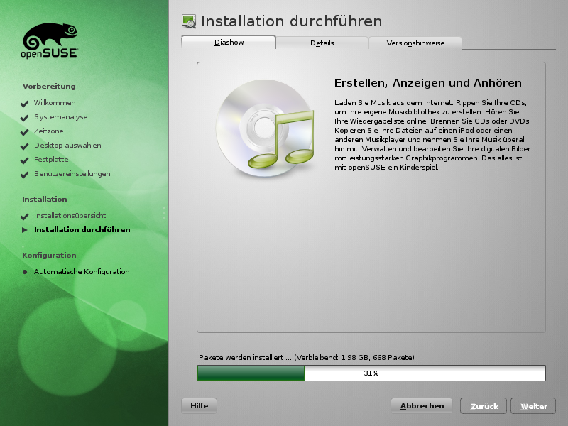 Nach Abschluss der Installation aller ausgewählten Softwarepakete und der Einrichtung des Basissystems wird die openSUSE-Installation im neuen Linux-System gestartet, um die automatische Systemkonfiguration durchzuführen. Mithilfe dieser Routine werden Ihr Netzwerk und Ihr Internetzugang konfiguriert und Ihre Hardware eingerichtet. Für diesen Vorgang ist keinerlei Interaktion erforderlich.
