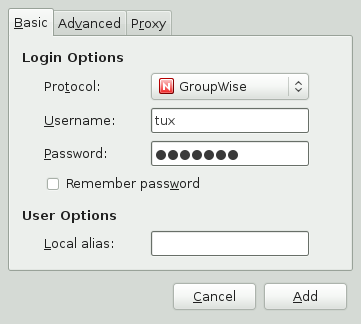 Enter the data received on registration with the messaging service. This usually consists of the username or email address and a password. Your protocol might support additional options, such as a buddy icon, alias, login options, or others.