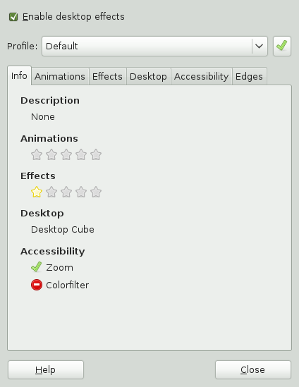 The default set of desktop effects is now enabled. You can change the enabled effects and their settings on the several tabs of the dialog or just select a from the dropdown list. To activate the selected profile press the green button.