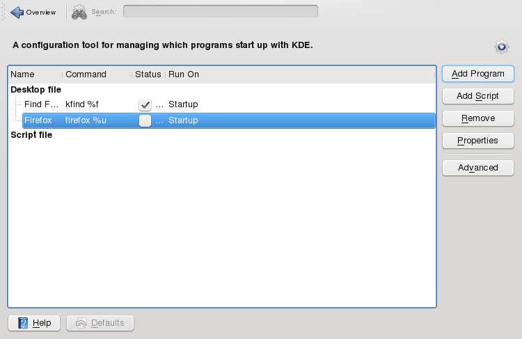 To add a shell script, click and click the icon in the next window to select the script from the file system. The program or script is added to the list and you can view and change the .