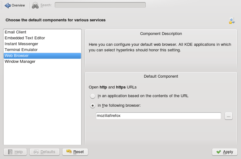 A dialog opens, showing the main menu structure. Select the Web browser to set as default and click . The component chooser now shows the selected application in the display field.