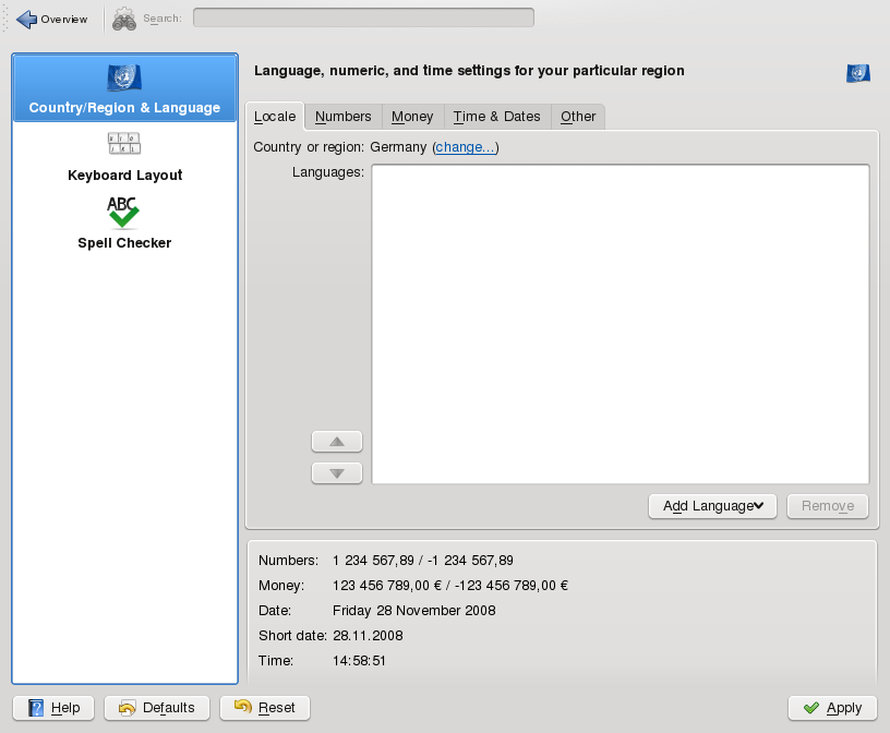To adjust settings such as time and date format, number format, or currency, select the desired country as the default country in KDE. If more than one system language is installed on your computer, you can also select the different languages in which KDE should show the graphical user interface and application interfaces.