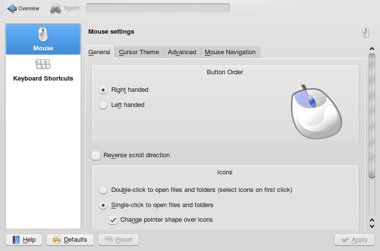 Holds settings for changing the default paths to the subdirectories of your home directory. Allows you to change the default applications (like e-mail client, text editor, messenger, and Web browser) that are called whenever a KDE application needs to start applications of these types. Define country and language-specific options here, such as default spell checking options, currency, number and date format, and keyboard layouts for different languages. This category also offers accessibility options for handicapped users, such as sound and keyboard options and mouse gestures.