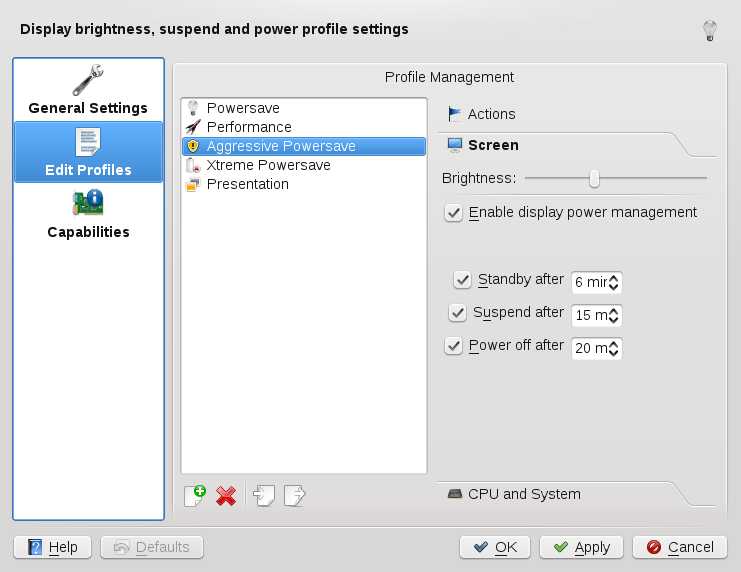 In KDE 4, you can control power management functions supported by your system with just a few clicks on the desktop. You can choose between various power management profiles to match the tasks your system is facing. The hold a category, allowing you to configure detailed settings as described in Section 9.3, “Configuring Power Management”.