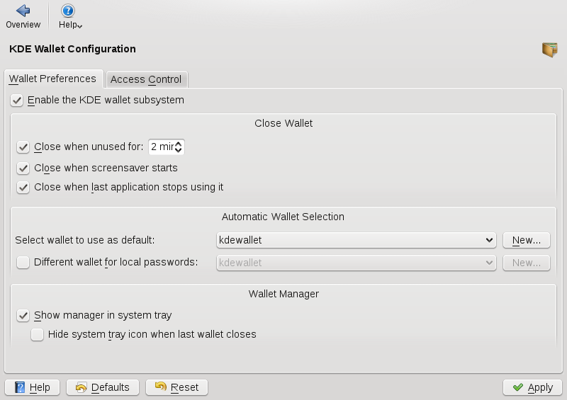 By default, all passwords are stored in one wallet, , but you can also add new wallets. Once configured, KWallet appears in the panel. You can also start KWallet manually by pressing Alt+F2 and entering kwalletmanager.