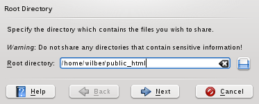 When sharing a directory, all files in the directory and its subdirectories are made publicly available, including hidden files (files that start with a dot) and symbolic links. Be careful not to share sensitive information, such as passwords, cryptographic keys, your address book, or documents private to your organization. Make sure that any symbolic links included do not point outside your published folder, because that would give others access to areas of your system that are not intended for public viewing. | |