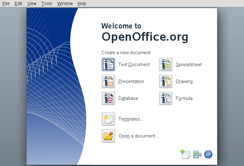 To start the OpenOffice.org suite, press Alt+F2 and enter ooffice. The OpenOffice.org window opens.