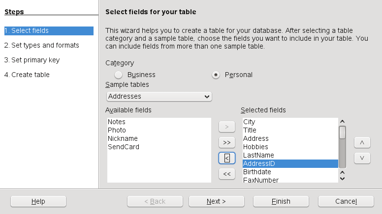 Base comes with several predefined database fields to help you create a database. A wizard guides you through the steps to create a new database. The steps in this section are specific to creating an address book using predefined fields, but it should be easy to follow them to use the predefined fields for any of the built-in database options.
