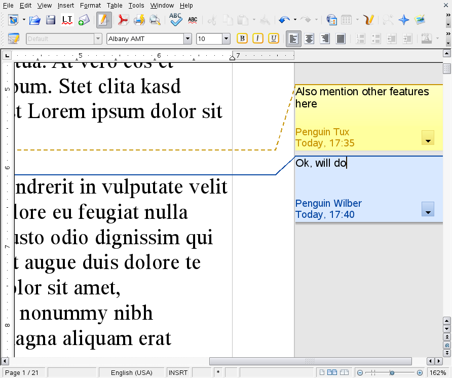 When editing or reviewing a document, users can add notes to the text. In contrast to earlier versions of OpenOffice.org where notes were only shown as small rectangles within the text, the notes are now displayed on the side of the document. Notes from different users are displayed in different colors and also show editing date and time.