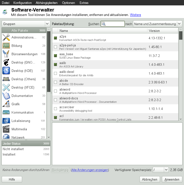 Ändern Sie die gesammelte Software auf Ihrem System mit dem YaST-Software-Manager. Dieses YaST-Modul ist in drei Toolkit-Varianten erhältlich: Qt (für KDE-Arbeitsflächen), GTK+ (für GNOME-Arbeitsflächen) und ncurses (mit einer pseudografischen Benutzeroberfläche im Textmodus). In diesem Kapitel werden die Varianten Qt und GTK+ näher beschrieben. Weitere Informationen zu YaST in der ncurses-Variante finden Sie unter Kapitel 10, YaST im Textmodus.