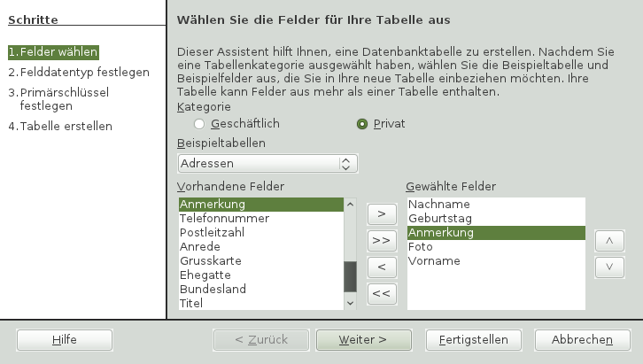 Im Lieferumfang von LibreOffice Base sind mehrere vordefinierte Datenbankfelder enthalten, mit deren Hilfe Sie Datenbanken erstellen können. Ein Assistent führt Sie durch die zur Erstellung einer Datenbank erforderlichen Schritte. Die folgenden Schritte beziehen sich auf die Erstellung eines Adressbuchs anhand von vordefinierten Feldern. Anhand dieser Beschreibung können Sie jedoch auch andere vordefinierte Felder für andere integrierte Datenbankoptionen verwenden. Die Erstellung einer Datenbank lässt sich in mehrere Vorgänge unterteilen: