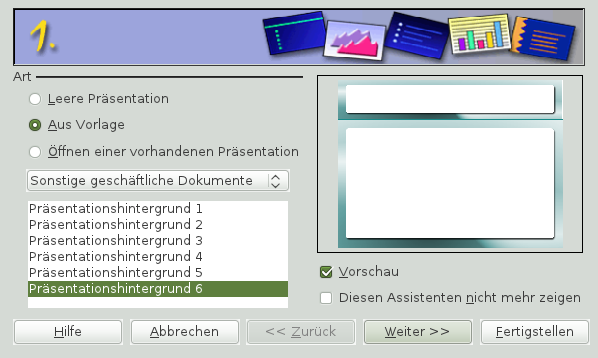 Sie können entweder eine völlig neue Präsentation (ohne vorformatierte Folien) erstellen oder für Ihr neues Dokument eine vorhandene Vorlage oder Präsentation verwenden. In Impress werden Stile und Vorlagen auf dieselbe Weise verwendet wie in anderen LibreOffice-Modulen. Ein Assistent führt Sie durch die Optionen zur Erstellung neuer Präsentationen.