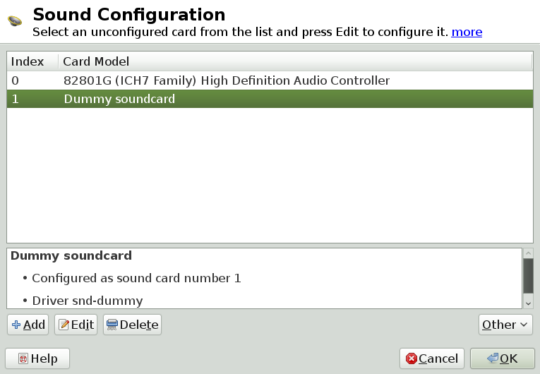 To change the configuration of an individual sound card (for experts only!), select the sound card entry in the dialog and click .