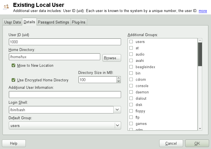Local users accounts are created according to the settings defined on the tab. Learn how to change the default group assignment, or the default path and access permissions for home directories in Section 9.4, “Changing Default Settings for Local Users”.