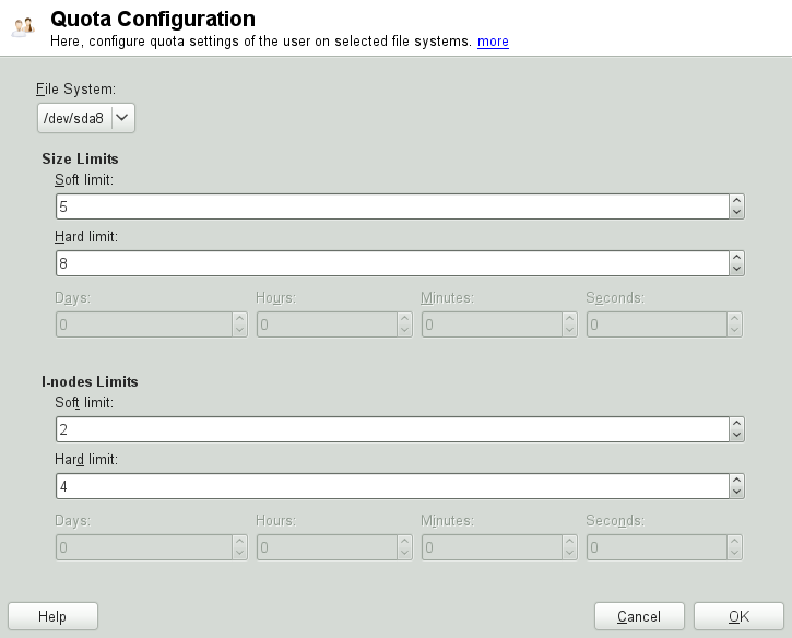 You can only define grace intervals if the user or group has already exceeded the soft limit specified for size or inodes. Otherwise, the time-related input fields are not activated. Specify the time period for which the user or group is allowed to exceed the limits set above.