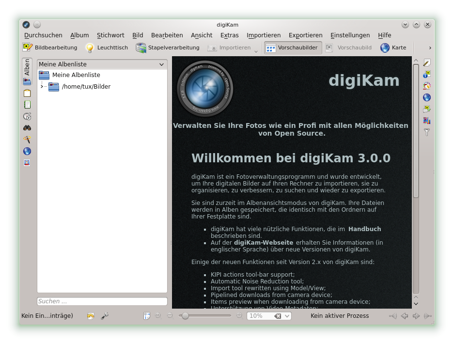 Um digiKam zu starten, drücken Sie Alt+F2, und geben Sie digikam ein. Beim ersten Starten wird der Assistent für den ersten Start geöffnet, der Sie durch die Einrichtung führt. In der Regel könnne Sie alle Fragen mit bestätigen.