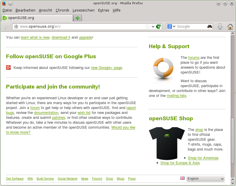 Abgesehen von Konqueror (dem Standard-Webbrowser von KDE) enthält openSUSE auch den Firefox-Webbrowser. Zum Starten von Konqueror oder Firefox drücken Sie Alt+F2 und geben Sie konqueror oder firefox ein.