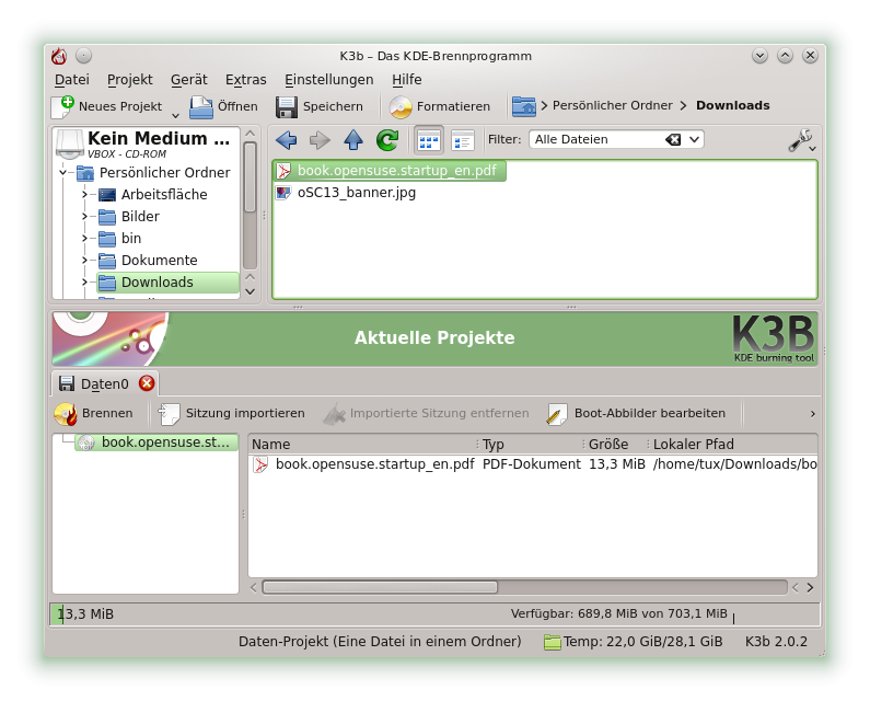 Wenn Ihr Computer über einen CD- oder DVD-Brenner verfügt, können Sie mit K3b Dateien auf CD oder DVD brennen. Führen Sie zum Erstellen einer Daten-CD oder -DVD die folgenden Schritte aus: