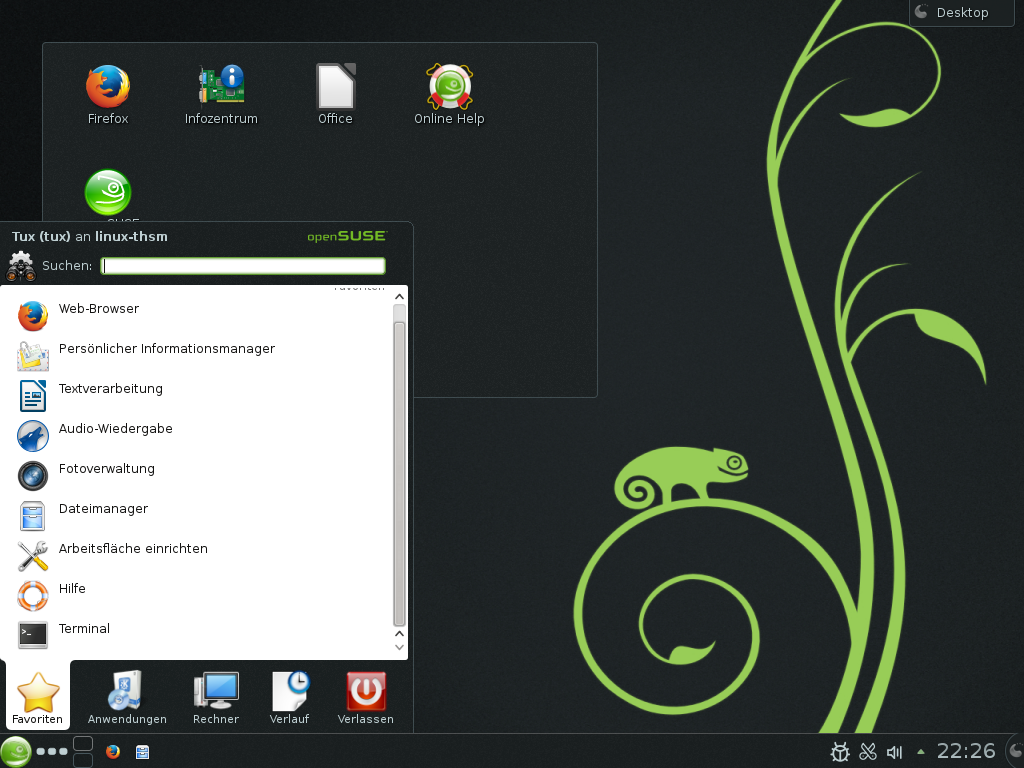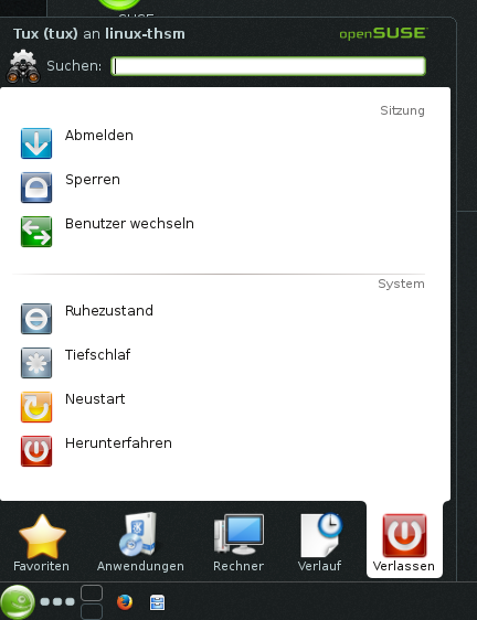 Melden Sie sich ab (während das System weiterhin ausgeführt wird), starten Sie den Computer neu oder fahren Sie ihn herunter. Dazu öffnen Sie zunächst das Hauptmenü (indem Sie auf die Schaltfläche mit dem Chamäleon in Ihrer Kontrollleiste klicken) und wechseln Sie dort auf das Register .