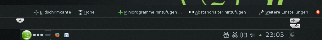 Klicken Sie zum Löschen einer Kontrollleiste mit der rechten Maustaste auf eine leere Stelle in der Kontrollleiste, die gelöscht werden soll, und wählen Sie + aus. Bei openSUSE muss mindestens eine Kontrollleiste auf der Arbeitsfläche verbleiben.