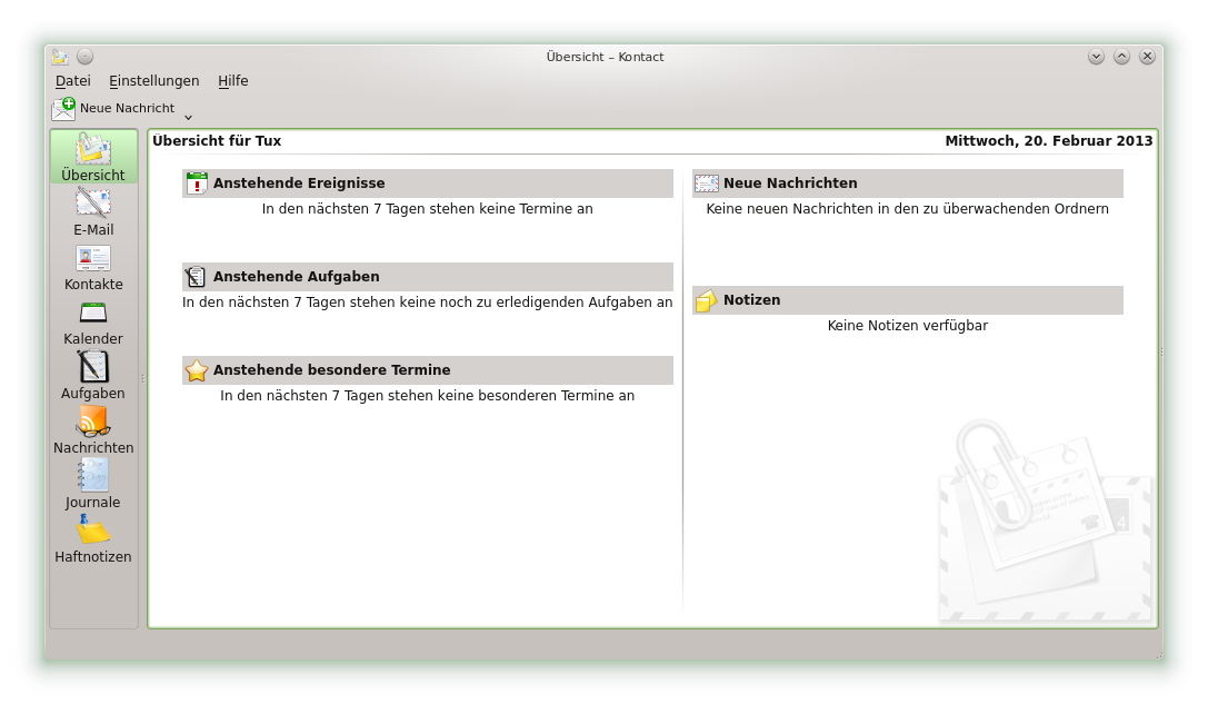 Zum Lesen und Verwalten Ihrer E-Mails und Ereignisse können Sie Kontact als Ihr persönliches Werkzeug zur Informationsverwaltung (PIM) verwenden. Kontact kombiniert KDE-Anwendungen, wie KMail, KOrganizer und KAddressBook, in eine einzige Oberfläche. Dies erleichtert Ihnen den Zugriff auf E-Mails, Kalender, Adressbuch und andere PIM-Funktionen. Kontact kann auch mehrere E-Mail-Konten verwalten.