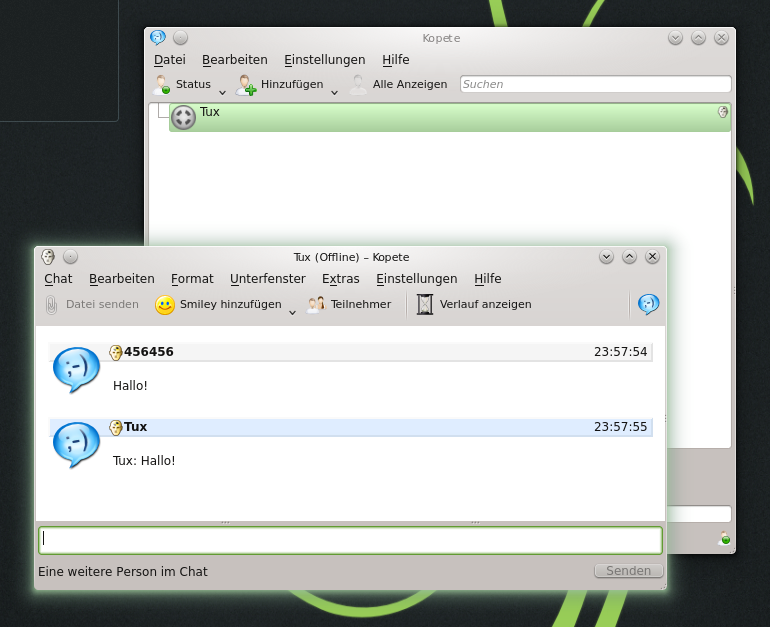 Kopete ist eine Online-Messenger-Anwendung, mit der mehrere Personen über das Internet sich miteinander unterhalten können. Kopete unterstützt derzeit alle bekannten Messenger-Protokolle, wie AIM, Gadu-Gadu, GroupWise® Messenger, ICQ, Jabber*, SMS und Yahoo!*. Um Instant Messaging (IM) verwenden zu können, müssen Sie sich beim einem Provider von IM-Diensten registrieren und ein Kopete-Konto konfigurieren.