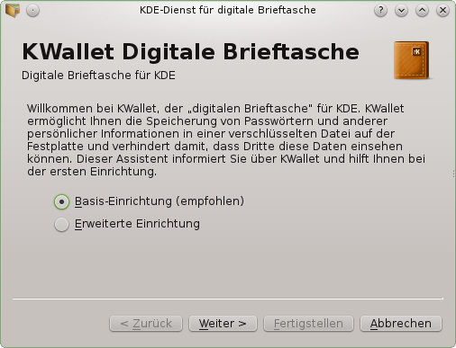 Wenn Sie in einer KDE-Anwendung zum ersten Mal ein Passwort eingeben (zum Beispiel in KMail oder in Konqueror), werden Sie gefragt, ob Sie das Passwort speichern möchten. Wenn Sie dem zustimmen, startet standardmäßig der KWallet-Assistent. KWallet ist ein Werkzeug zur Passwortverwaltung, das alle Passwörter sammeln und in einer oder mehreren verschlüsselten Dateien (sogenannten „Brieftaschen“) speichern kann.