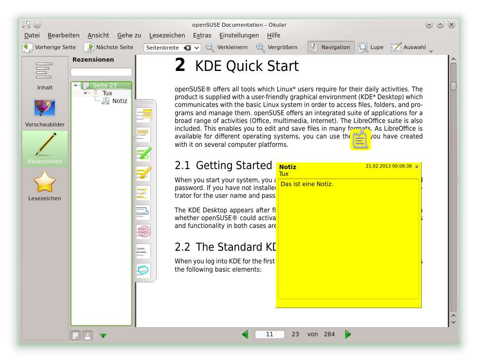 Mit Okular können Sie ein Dokument überprüfen, indem Sie bestimmte Textpassagen hervorheben oder Anmerkungen oder Lesezeichen hinzufügen, die Okular dann in Form von Metadaten zur Datei hinzufügt. Beachten Sie, dass die hinzugefügten Anmerkungen und Kennzeichen nicht im Dokument gespeichert werden, sodass Sie diese nicht drucken oder an andere Benutzer weiterleiten können.