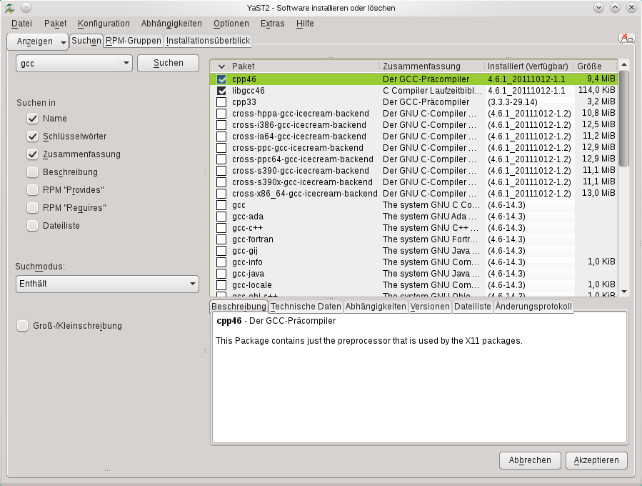 Das Installieren von Quellpaketen mit dem YaST-Software-Manager ist zurzeit nicht möglich. Verwenden Sie zu diesem Zweck das Kommandozeilenwerkzeug zypper. Weitere Informationen finden Sie unter Abschnitt 9.1.2.1, „Installation von Quellpaketen“. | |